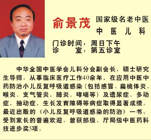 余景茂 全国名老中医学术经验继承指导老师、主任中医师、教授、硕士生导师 中华中医药学会儿科专业副会长、浙江中医药学会常务理事、中医药高等教育学会儿科临床分会副理事长、第四批全国老中医药专家。 1965年开始从事儿科专业,师承全国著名儿科学家王伯岳研究员。专业特长为中医儿科学;擅长小儿哮喘、反复呼吸道感染等呼吸系统疾病、小儿遗尿、儿童多动症等。拟太子健冲剂防治小儿反复呼吸道感染,太子健Ⅱ及固本克喘膏治疗小儿哮喘,遗尿停治疗小儿遗尿症,临床经验丰富,疗效甚佳。主持5项省厅级课题,并多次获科技进步奖及成果奖。主持编写各类著作、教材30余部,在国家及省级期刊上发表论文40余篇。 专家门诊时间、地点